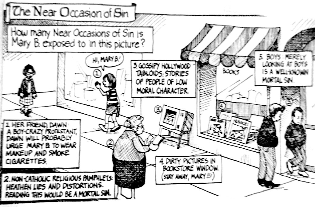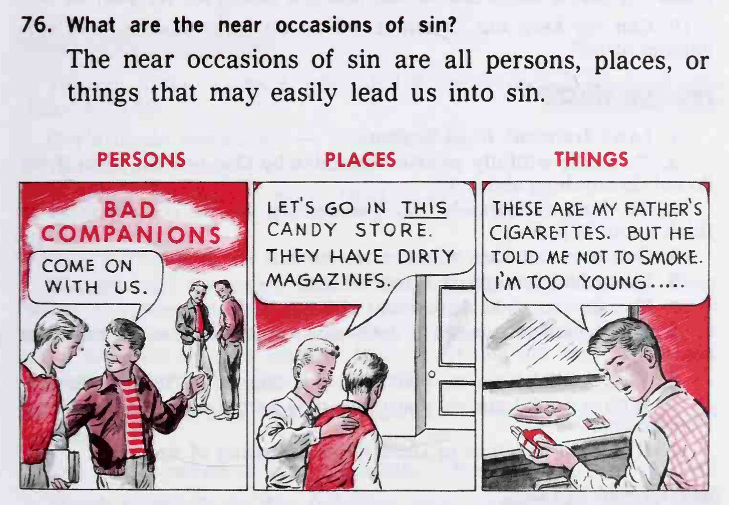 Here below I will be presenting the 1956 English translation of Prümmer’s text in a slightly reorganized and lightly edited format, with minimal alterations to the original terminology.Penitents are said to be in the occasion of sin when they are in a proximate occasion of sin. An occasion of sin is any extrinsic circumstance (person, thing, book, play, etc.) which offers a strong incitement to sin and a suitable opportunity.